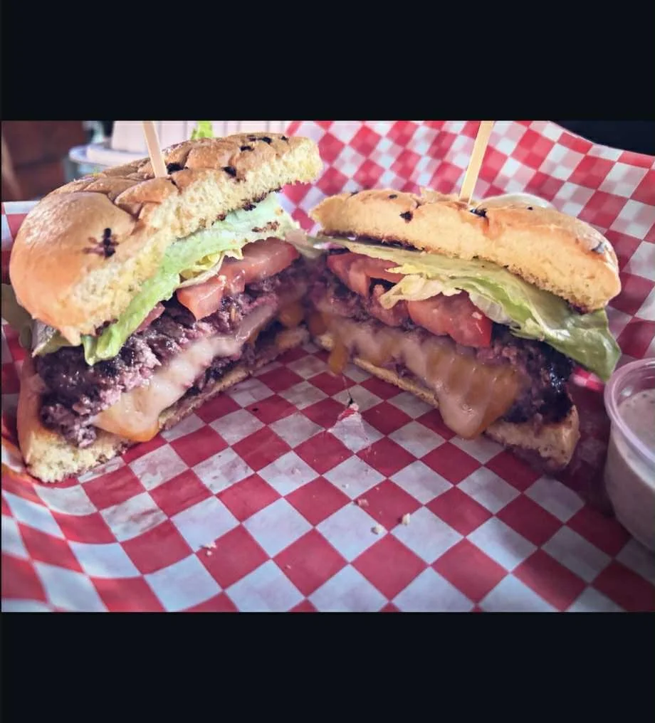 Two ½ lb patties with Swiss, Cheddar, Brightwood sauce, lettuce & tomato.