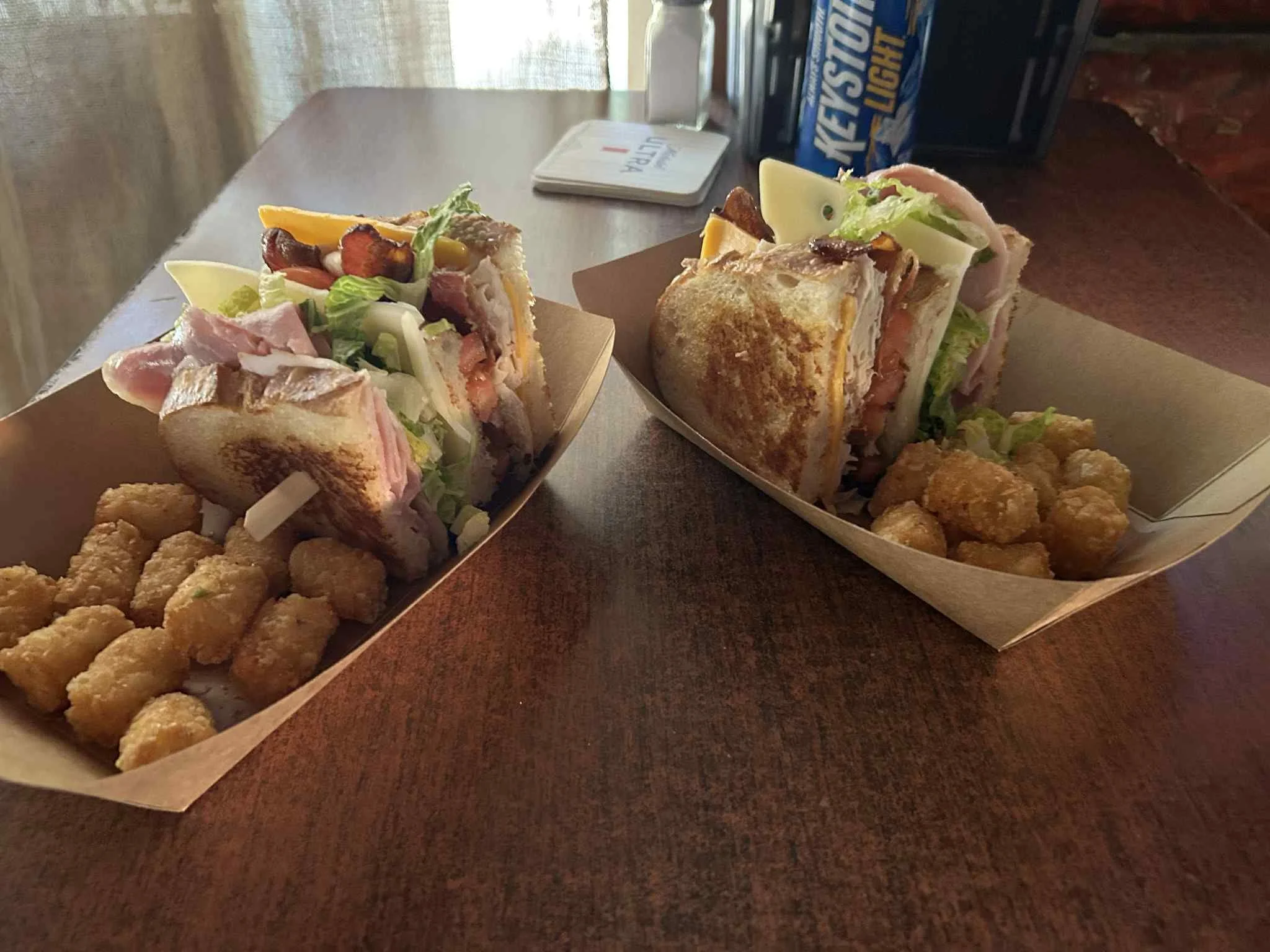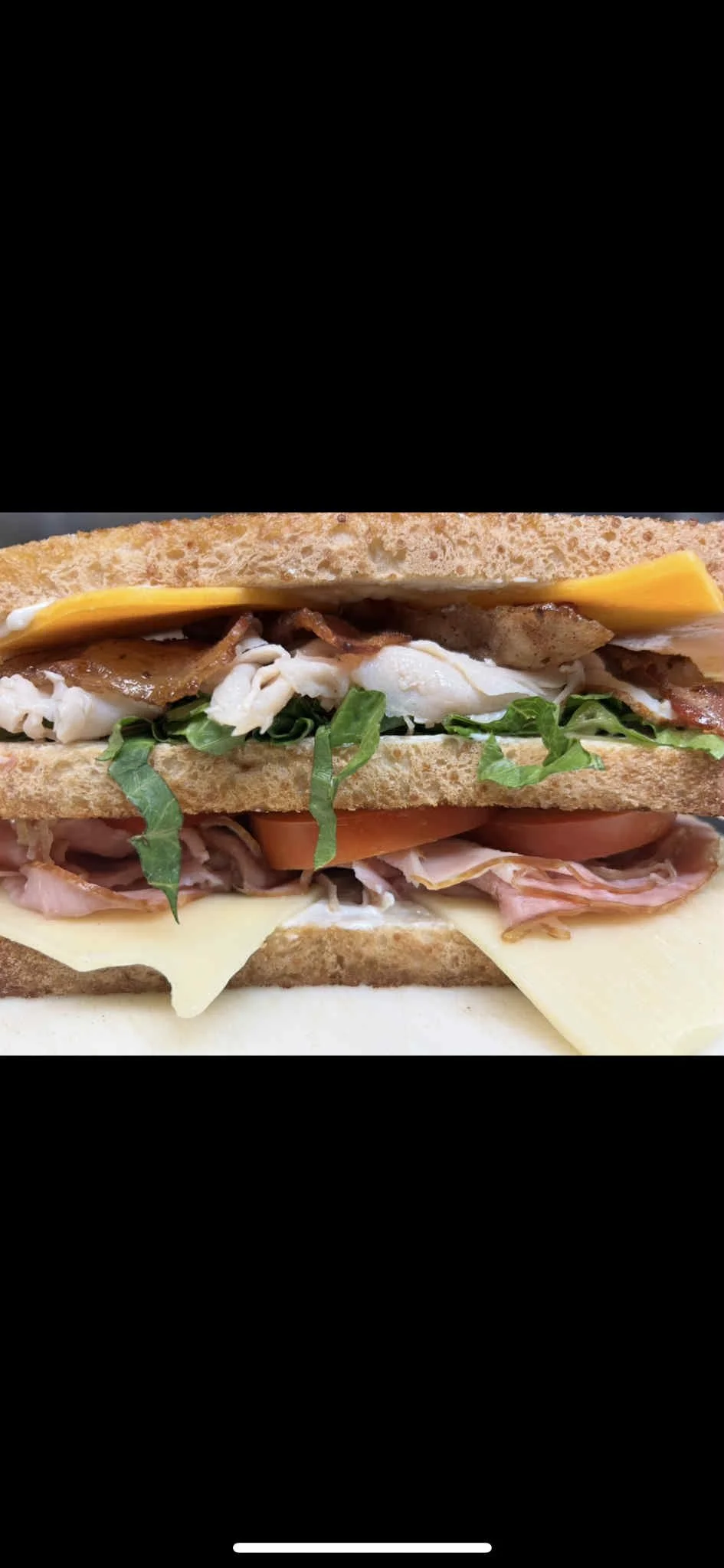 Turkey, ham, bacon, lettuce, tomato, Swiss & Cheddar stacked on toasted sourdough.