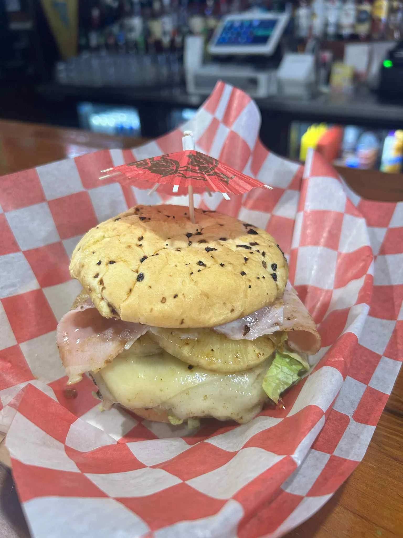 ½ lb patty grilled with onions & Swiss cheese on rye bread.