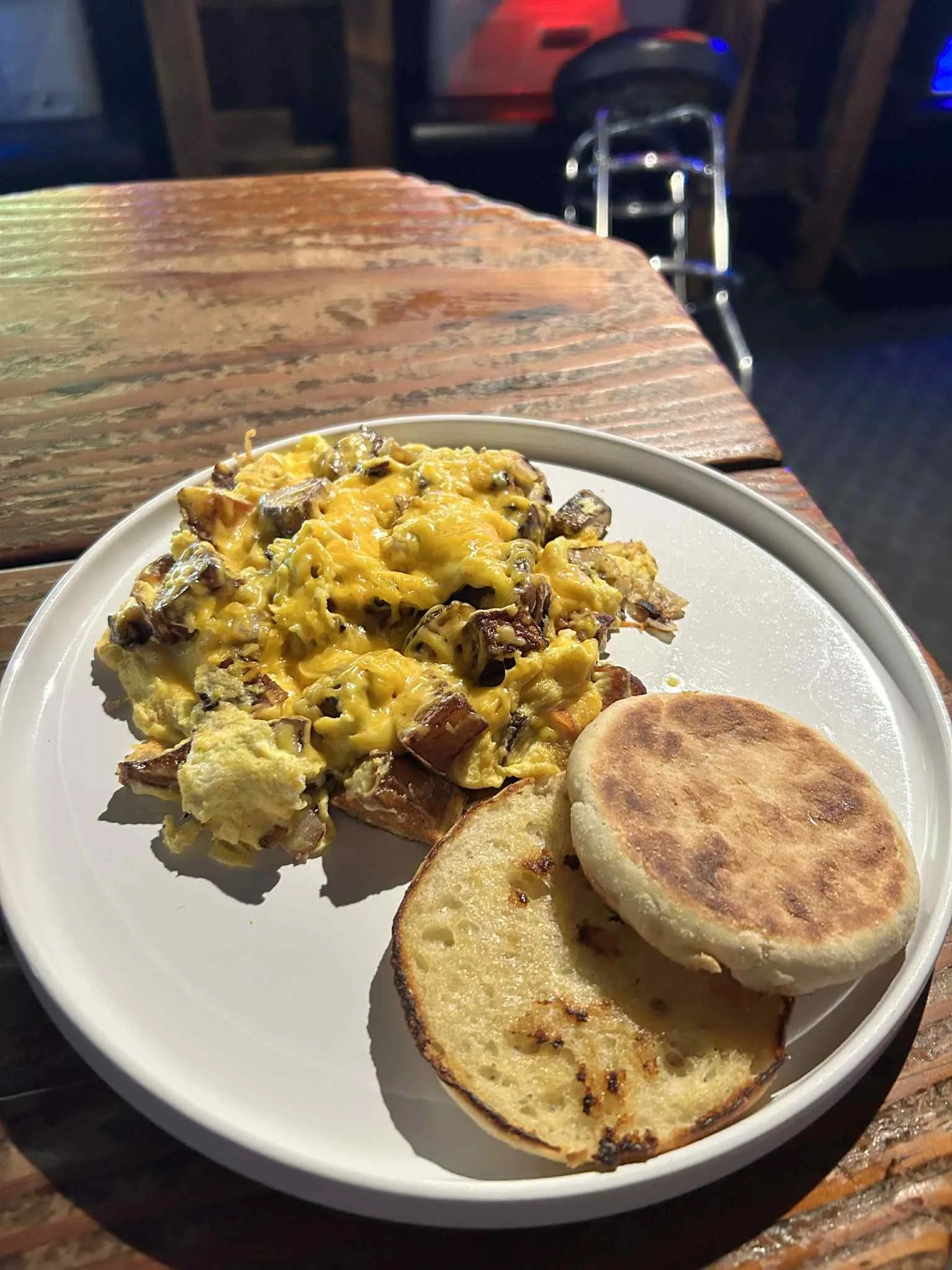 Sausage or bacon, eggs scrambled with fried potatoes, grilled onions & cheddar cheese. Served with choice of sourdough or English muffin.