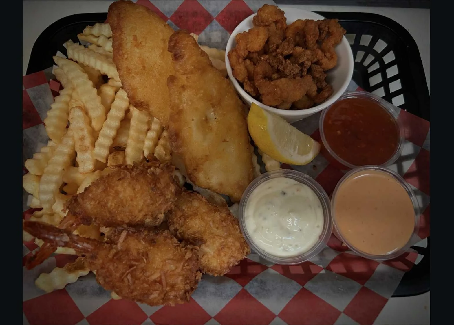 Deep fried white fish with fries or tots, lemon & tartar sauce.